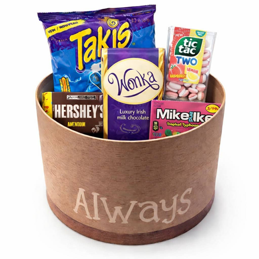 Az Always Box egy elegáns, kerek ajándékdobozba válogatott nemzetközi snack- és édességkülönlegesség, amely garantáltan mosolyt csal az arcokra. A modern, letisztult megjelenésű boxban ikonikus amerikai és nemzetközi finomságok kaptak helyet — ajándékozásra készen, látványos összeállításban.