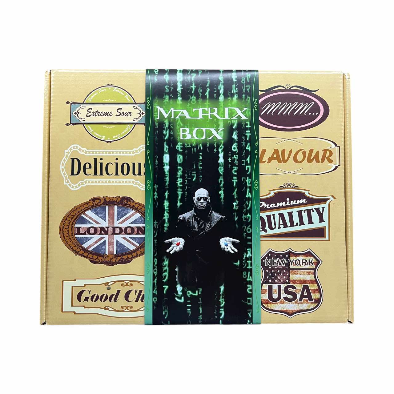 Matrix Box 25 féle édesség piros és kék színben + ajándék filmplakát fémtábla